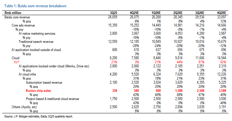 摩根大通预计百度GPU计算收入(基于订阅的AI云基础设施收入)将在2026年翻倍。Q3GPU租赁订阅收入同比增长128%,相比上一季度约50%的增幅进一步加速。